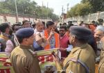 नगर निगम पर प्रदर्शन, बैरिकेडिंग के बीच कार्यकर्ताओं ने किया हनुमान चालीसा का पाठ